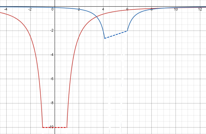 Einstein, remembering that we are working with energy, would add the gradients. Holding the higher (right) end fixed at the mass (-2), decrease the lower (left) end by the amount the red curve changes across the blue particle as it moves. Don’t forget to take into account the time it takes for the blue particle to cross a given amount of space. (Action is the principle of motion here.)
